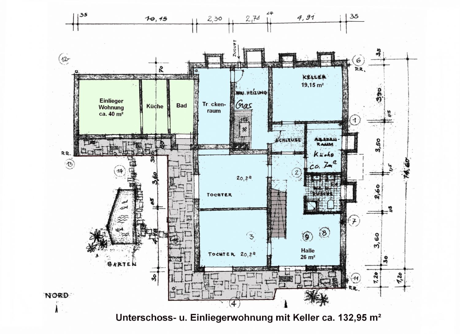 Dieses traumhaft und ruhig gelegene Zweigenerationenhaus mit Einliegerwohnung, hat über 8,5 Zimmer mit einer Gesamtwohnfläche von ca. 300 m² Wohnfläche ( ca.60,00 m² Nutzfläche) und befindet sich in Stadtnähe. Auf zwei Ebenen verteilt finden Sie alles was Sie für sich und Ihre Familie brauchen. Im Erdgeschoss dieses Wohnhauses befindet sich die großzügige ca. 189 m² große 5,5 Zimmerwohnung mit großem Balkon und Garten. Über den Eingangsbereich kommen Sie in das ebenerdige Untergeschoss und in die großzügige 2,5 Zimmer ca. 70,00 m² Wohnung. Sie betreten, über einen Flur, die geräumigen Kellerräume und den Technikraum. Vom Haupteingang aus gelangen Sie in den idyllischen Garten, und in die ca. 40,00 m² großen 1,5 Zimmer Einliegerwohnung. Das gesamte Untergeschoss hat eine Größe von ca. 132,95 m² mit großen Kellerräumen, Wasch- und den Heiz- und Technikraum.